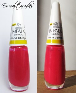 Já tem um tempo que não uso o tão surrado vermelho nas unhas. Com tantas opções de cores, hoje em dia, meus vermelhos ficaram escondidos num cantinho da maleta preparando uma conspiração contra mim. Deus ouviu suas preces e finalmente entrei num clima de flashback , e pintei as unhas à la femme fatale. A cor escolhida foi Maria Cereja, irmã gêmea da Maria Flor, da Impala. Tem também um quê de 5ª Avenida da Colorama. É um vermelho bem diferente, meio puxado pro rosa. Não sei explicar direito. A única coisa que eu consigo dizer COM CERTEZA, é que na foto a cor não fica igual ao vivo e em cores. Até tentei tirar uma foto “studio” e uma no sol, mas não houve jeito de mostrar a cor. Só sei que é um vermelho muito bonito e alegre.
