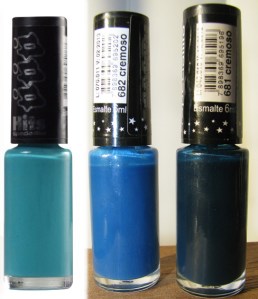Os tons azuis-esverdeados (teal) se tornaram minha paixão desde o dia em que bati o olho no SKI TEAL WE DROP da OPI e o comprei numa loja de cosméticos em Nova York. Desde então, sempre que vejo alguma cor parecida na internet eu fico antenada. Ontem, navegando pelos blogs alheios da vida, descobri, no site de uma blogueira inglesa, uma marca de esmalte que eu nunca tinha ouvido falar, a A ENGLAND, que por sinal, entrega no Brasil. A A ENGLAND Só tem uma única coleção, chamada THE MYTHICALS, que tem 17 míseras cores de esmaltes (todas com nomes de personagens da estória do Rei Arthur), mas bati o olho no único que me chamou a atenção, o GALAHAD, que é um teal bem mais claro que o teal da OPI. Como eu nunca vi essa cor por estas bandas tupiniquins, eu resolvi testar uma mistureba. Peguei o MABI (HITS), que é predominantemente verde, cujo vidro tinha aproximadamente 90% de esmalte, para dar o tom azulado, juntei uns 8% de 682 (HITS) e uns 2% de 681 (HITS). Gente, fiquei de queixo caído como tenho realmente um olho bom pra fazer misturas. Ficou simplesmente igualzinho ao GALAHAD. Fiquei super apaixonada pela cor, e as amigas também! (já me pediram emprestado…) Tanto que o esmalte que pintei anteontem arranquei correndo, pra poder testar. Ficou um escândalo de lindo!
