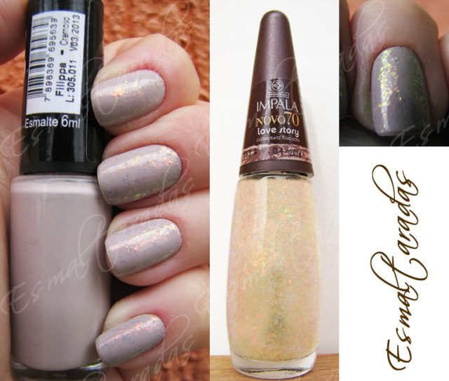 Fui num aniversário ontem, e, definitivamente, estar com aquele verde nas unhas, com a roupa que eu usei, seria como pendurar uma melancia no pescoço. O esmalte estava muito bonito, mas para uma roupa casual, e não chique. Sendo assim, resolvi tirar o verdinho esperança e coloquei algo mais sóbrio, mas que ficou um chiquê! Filippa da Hits (Coleção Pop UP – a do pincel quadradinho) com cobertura Love Story da Impala.