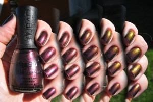 Ele é um duocromático, irmão gêmeo do Iris Dust, sendo que a cor predominante no Iris é um vermelho carne, e já o Moon Shadow é cor uva (e não vinho, como aparece na foto). Ambos têm como cor secundária o amarelo, que aparece quando vemos o esmalte no plano horizontal contra a luz.