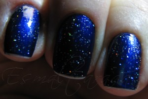 Como vocês sabem, o star um glitter bem fininho holográfico (que fica de cores diferentes dependendo da posição de incidência da luz). Apliquei o Star sobre o estonteante azul do Starstruck (é estrela demais para uma só esmaltação, rsrsrsrsrs), e ficou parecendo um céu estrelado. Ficou liiiiindo! O brilho do star, como diz o nome, parece mesmo o de uma estrela.