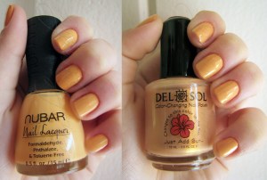 O dia hoje está lindíssimo. Não tem uma nuvenzinha pra poluir o céu. E Gabs resolveu trocar de esmalte de novo. Sugeri que usasse o laranjinha lindíssimo no qual eu andava de olho há um tempinho, o ORANGE CREAM da Nubar. É um laranjinha suave, pastel, muito fofo. Para fechar com chave de ouro, eu sugeri que colocasse o SUN KISSED da Del Sol, que é um cintilante laranjinha, que fica vermelho sob o sol. Como o fundo do esmalte era o laranjinha da Nubar, o resultado sob o sol foi um coral escuro, muito bonito. Confiram!