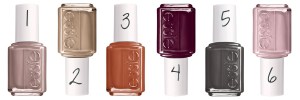 Essa é a coleção CARRY ON da Essie, lançada para o outono deste ano. As cores são (compare com a numeração na foto):