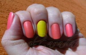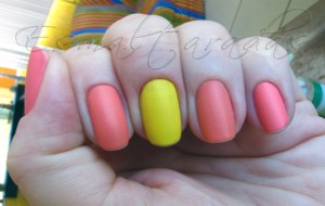 Quando cheguei em casa fiz um teste, pintando uma unha de cada cor. Depois que eu pintei é que reparei que ficou um lindo degradê. O resultado não podia ser outro. Pintei assim e deixei. Só que fiz o acabamento com a cobertura fosca da Colorama. Ficou um reloginho bem fashion Verão; olhem o resultado:
