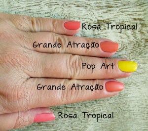 Ontem fui ao centro da aldeia aborígene, e, pra variar, fui nas lojas ver se havia alguma novidade, já que nesse fim de mundo tudo demora a chegar. Encontrei lá o esmalte que há tempos eu andava atrás, o Grande Atração da Colorama, e aproveitei pra comprar o Rosa Tropical também. Acabei “esbarrando” no Pop Art, para o qual a Nina teceu vários elogios, dizendo que ficava lindo nas unhas, que dava um UP e tals. Me fingindo de morta, o joguei na cestinha e comprei também, “por engano”.