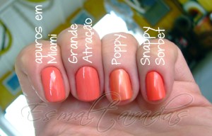 O Poppy é basicamente o Apuros em Miami, só que cintilante. O tom é muuuuito parecido, só que como o Poppy é cintilante, parece mais claro. Já o Snappy Sorbet é bem chegayzinho. Dos 4, ele é o mais chamativo e mais vívido. Enquanto os outros três são cores calminhas, o Snappy Sorbet é eletrizante; um coral mais “festivo”.