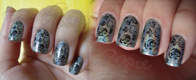 Ela usou na de cima (mão direita) o esmalte LOL da China Glaze, que é um holográfico roxo muito lindo, e por cima Hefesto da Hits. Finalizou com carimbo m65 da Konad com esmalte para carimbo preto da Blant Colors.