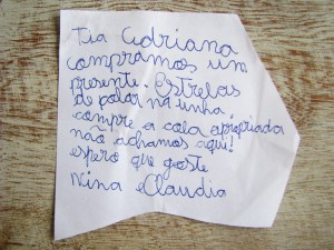 AMAY e cacay com o presente, mas infelizmente eu tinha feito as unhas algumas horas antes da surpresa, então vai ter que ficar pra próxima esmaltação. As estrelinhas são uma graXinha, e os vidrinhos, mais fofos ainda. Tem estrelinha para eu usar até uns 90 anos de idade! rsrsrsrsrs E olhem esse recadinho, gentem!!!!! Não é fofo?????? AMAY tudo! Obrigada Nina e Bica!