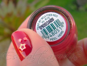 Usei, finalmente, as estrelinhas que a Nininha (minha sobrinha) me mandou. Ficou uma gracinha, mas a estrela podia ser um pouquinho menor. Como ela é grandinha e durinha, ela não acompanha a curvatura da unha, e assim uma ou outra ponta fica “espetada” pra fora. O que eu fiz foi passar uma GENEROSA camada de top coat (Won’t Chip da Orly) por cima delas, pra ver se o top coat conseguia assentar um pouco a estrela. Melhorou bastante, apesar de as pontinhas arranharem um pouco. Mas acho que é só uma questão de me acostumar.