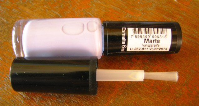 Estava aqui trabalhando, quando o correio passou para deixar a caixinha com o pincel novo. Nisso, se passaram somente DOIS dias, mesmo com os correios em greve. Foi super rápido. Quando abri a caixinha pra tirar meu pincel novo, tive duas surpresas: a primeira é que o pincel que enviaram é aquele achatadinho maravilhoso das coleções novas. A segunda surpresa foi que mandaram, ainda, um esmaltinho de uma cor que eu não tinha ainda (ainda bem), que é o Marta, um lilazinho super fofo, da coleção Ti Ti Ti.