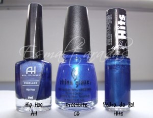 Vi muitas fotos dele antes de ter certeza que precisava ter um exemplar pra chamar de meu. Morri de medo de que ele fosse parecido com algum esmalte que eu já tinha aqui, mas mesmo assim pedi-o-o hehe (a gente sempre acha uma desculpa pra se convencer de que precisa comprar mais um esmalte, mesmo achando que ele pode ser o irmão gêmeo de algo que já se possui). Pra tirar essa dúvida, comparei ele com o Hip Hop da Ana Hickmann e com o Pedra do Sol da Hits (que era o que eu imaginava ser o irmão gêmeo desgarrado do Frostbite). Vejam os vidrinhos: