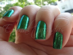 O Ivanka é um verde folha com acabamento glass flecked e com um leve duochrome azul, que se vocês fizerem uma certa força e usarem a imaginação enxergarão nas fotos abaixo. Ele fica super lisinho, mesmo sem o top coat. As fotos podem passar a ideia de que ele fica crespinho, mas eu juro que não fica.