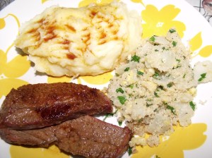 Carne assada, purê de batatas com alho frito na manteiga e farofa de ovo, com cebola e salsa.