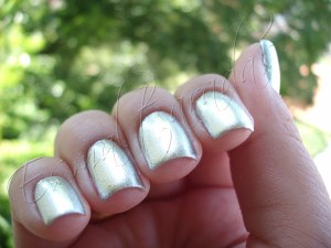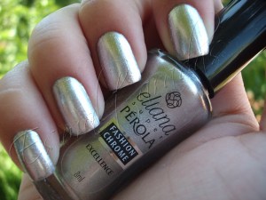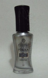 O primeiro prata que resolvi testar é o Excellence da Eliana Super Pérola, um prata cromado que brilha tanto que chega a doer os olhos hehe. Ele tem umas nano partículas que são meio chatinhas na hora de limpar o esmalte porque elas grudam na pele de um jeito tal que só vendo… mas ele não é glitter não. A textura depois de seco é super lisinha e não há necessidade de usar top coat. Ele fecha bem com duas camadinhas.