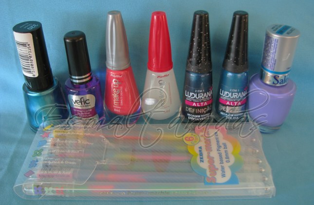 Voltando aos “presentchinhos”, as canetas multicoloridas são da Gabs. Ela cacou freneticamente (e vomitou arco-iris como ela mesma diz), porque disse que sempre teve um desejo incontido de comprar as ditas. Mas vocês sabem, não é, essas coisas phynas não encontramos por cá não. Mal encontramos BIC.