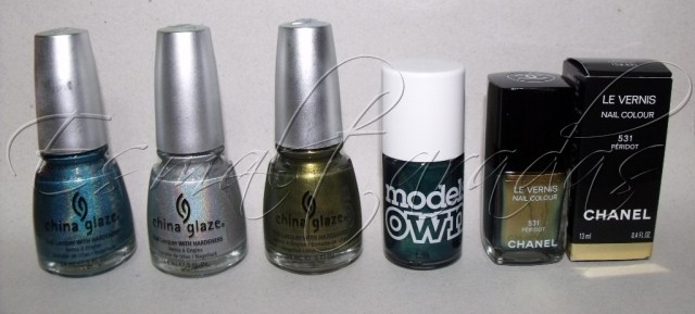 Da esquerda para a direita: CG, DV8 (thanks Dri!); CH, OMG; CG Peace on Earth (da Coleção de Natal de 2010); Models Own, Peacock Green; e, Chanel, Péridot. Um mais lindo que o outro, né?!