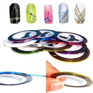 Porém, hoje eu ~acho que~ achei (gostaram do acho que achei?) algo decente pra postar (ou não…). Vi no site da Amazon, e também tem no mercado livre pra vender, umas fitinhas metalizadas adesivas que são próprias para fazer um nail art mais incrementado. As ditas cujas têm 1mm de largura e vêm enroladinhas, separadas por cores (como na foto abaixo, er…). Não sei se vocês já conheciam (eu não conhecia, hehe), mas pra mim foi divertido saber que isso existia.