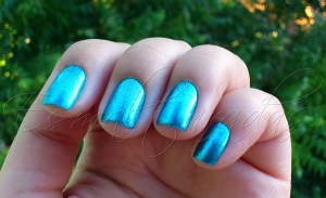 O que vocês verão nas próximas fotos é o resultado meia boca da esmaltação da manicure do salão da esquina de casa (que não é o mesmo que eu uso pros pés. No dos pés as gurias fazem um serviço muito mais decente, mas não tinha muito como escolher, porque num sábado de evento na cidade fica difícil conseguir horário pra qualquer coisa. Fora que esse fica só a meia quadra de casa. Enfim, só pra me quebrar esse galho mesmo, e só dessa vez). A manicure precisou de duas camadas sovinas do Metallic Aqua e mais uma de Invincible, o top coat mara que também veio do Brechó.
