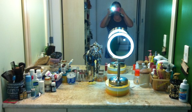 Aproveitei pra fotar meu “chiqueirinho de quase beleza”, uhauhauhahuuhauah Vejam o espelhinho de ampliação iluminado super-mara! Comprei na Macy’s em NY, em janeiro do ano passado, pela bagatela de 80 dólares. Foi a melhor compra que fiz nessa viagem. Lembro de ter procurado aqui no Brasil, mas era caro demais. Preferi comprar lá fora, onde tudo é mais barato.