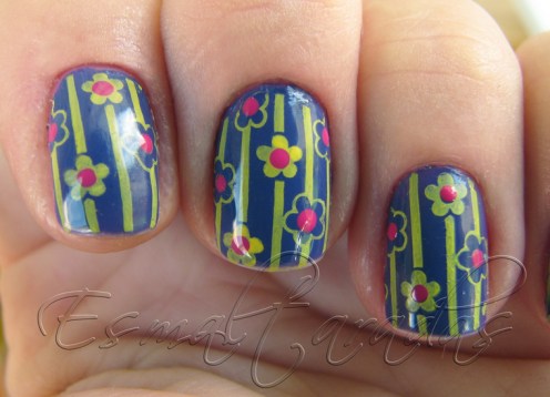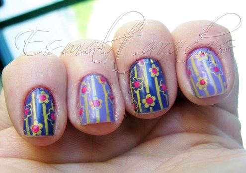 Pensando em usar o desenho C4 da DRK-A, eu resolvi fazer um fundinho roxo carimbado de amarelo, para ver como ficaria. Como os roxos eram ton-sur-ton, eu resolvi usar as duas cores para fazer uma comparação de tonalidades. O Petrizzio fica bem mais escuro que a cor no seu vidro depois de aplicado. Já o Saloon…. gente, o que é isso????? Que cor é essa????? Cakay freneticamente com o lilás do Saloon. Nina e Dory, vocês tinham razão!!! Que cor estonteante de linda!