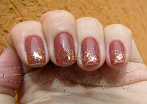 Resolvi experimentar nessa mani uma coisa que eu já cansei de ver por aí, para ver como iria ficar; eu passei só nas pontas das unhas o TRAFFIC STOPPER COPPER da Sephora, que é um glitter grande com pequenininhos, cor de cobre. Nossa, ficou super legal! Na foto o impacto não é tããão legal quanto ao vivo, acreditem! Eu achei mais bonito do que cobrindo a unha inteira, como eu fiz sobre o Beige Glamour neste post.