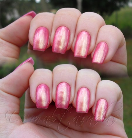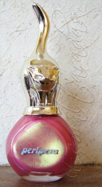 Esse peripera é um escandalo; fica rosado dependendo do movimento das mãos e fica rosado com dourado em outros movimentos. Além do mais, tem um cheirinho delicioso de morango (eu acho que é morango né…)!