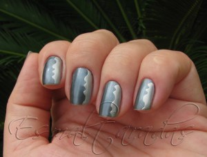 Peguei uma etiqueta branca comum, cortei usando essa tesoura, coloquei o adesivo sobre a unha, no sentido vertical, e passei o esmalte Cromo Prata da Impala. Vejam como ficou bacana.