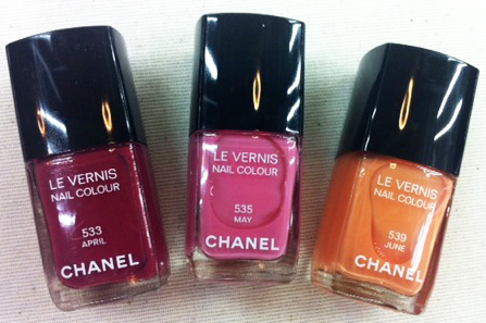 O mais do mesmo não fica só por conta de esmaltcheenhos nacionais não. A Chanel lançou a sua minicoleção de esmaltes para Primavera-Verão 2012, com cores já bem batidinhas, mas alegres. Os 3 esmaltes são “April”, “May”, e “June” (alguém acha que é falta de criatividade, a escolha dos nomes? – eu acho).