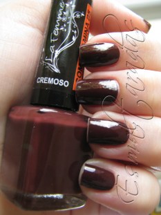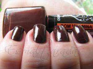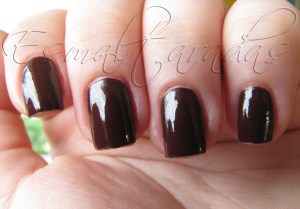 Nas unhas parece um marrom puxado para o vermelho. Nessa mani não usei top coat, porque Gabi queria carimbar.