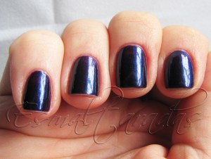Esse esmalte eu passei na outra mão, no dia em que coloquei o Barry M roxinho que postei ontem, já que esse La Femme é “roxildo” também. O AMESTISTA, da La Femme, é um esmalte com base transparente roxa e microbrilhos (shimmer) azuis.