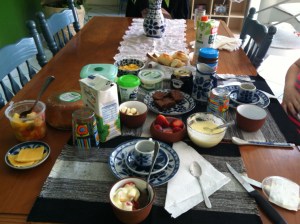 E para finalizar, antes que eu vá jantar e voltar pra labuta, mostro aqui a mesa de café da manhã que Mary preparou para mim no dia das mães. Esqueci de colocar aqui no domingo, hehehehe. Nina, os brownies estavam fantásticos. E o chantilly Mary fez com creme de leite fresco. Ficou fantástico!