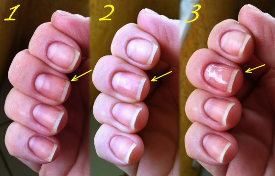 Daí eu pensei: poxa, eu não fiz o vídeo que eu tanto queria. E na preguicinha, resolvi fotar mesmo. Fiz o registro do brilho nas ex-cotoquettes (graças ao Vita Surge) com três fotos: 1) antes de usar a lixa, 2) usando o lado de preparação (rosa) e 3) usando o lado branco (acabamento). E o resultado mostro para vocês abaixo: