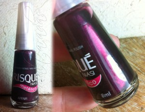 Eu tive um affair ha muuuuuuuuuuuuuuuuuuito tempo atrás. Eu lembro que ele era uma sacola pra passar, ralo que nem água, pelo jeito mudaram. Mas eu odeio a risqué do fundo do meu coração então nem fui mais atrás. Sério, detesto a risqué, detesto como o pincel dela é ruim, como os esmaltes mancham, como eles se recusam a secar, como eles descascam na velocidade da luz, DETESTO.Idem pra Colorama. ~revolts~