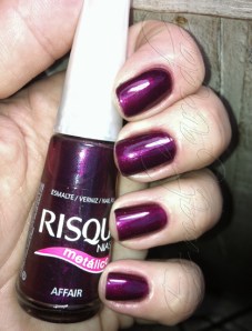 Eu estava na única loja que presta aqui, e bati o olho nesse esmalte. Em princípio achei bonito, mas achei que seria mais do mesmo. Comprei assim mesmo. Quando cheguei em casa, percebi que eu tenho poucos assim nesse tom. O AFFAIR, da Risqué, tem uma cor uva cintilante metálico.