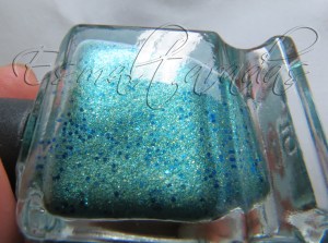 Esse esmalte, como a grande maioria dos esmaltes da marca, é uma composição de glitters. Ele tem uma base leitosa e glitter em pó dourado e verde água, e tem glitters maiores (mas não grandões) na cor azul-royal.