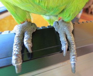 Hehehehe, e na BF de hoje, eu estava com a ave em cima do meu monitor, para não deixá-lo sozinho e abandonado lá na gaiola dele, e uma das distrações dele é ficar cutucando os pés para arrancar as escamas ressecadas, e com isso, fica caindo aquela “caspa” horrorosa no meu monitor. Olhei pra cara dele e resolvi pôr um fim na alegria dele. Agarrei-o à força e passei nos pés dele, que estavam totalmente brancos, de tão ressecados, o óleo fortalecedor de unhas da Granado, e espalhei com um pincel (o mesmo que uso para hidratar minhas cutículas). Gentem, vocês nem vão acreditar. Os pés dele ficaram tão hidratados e macios que até mudaram de cor; ficaram cinzas meio amarronzados (foto abaixo). Pena que eu não tirei foto antes para mostrar pra vocês como estavam completamente brancos de tão secos. Aproveitei o embalo e hidratei o bico também, heheheh. Agora a ave está com os pés fofinhos e hidratados, huauhahuhuahuauhauhahua, graças ao Óleo da linha Pink da Granado!