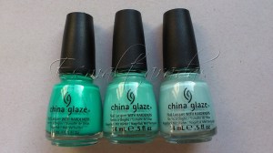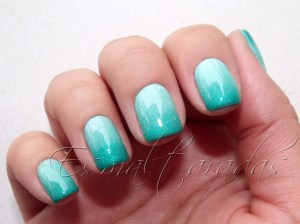Pra fazer essa mani, eu usei três cores de China Glaze (da mais escura para a mais clara): Turned Up Turquoise, Aquadelic e Kinetic Candy, além de uma esponja de cozinha, dessas bem comuns.