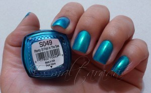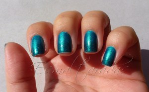 Começando pelo esmalte usado como “fundo”… Passei o Plenty Of Fish In The Sea, da Spoiled, um azul celeste metalizado, muito lindo, e que cobriu bem com duas camadas. Nas fotos abaixo não passei top coat. Não há necessidade.