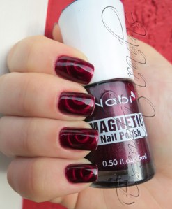 Passamos duas camadas, sendo que na segunda é que aplicamos o imã. Mas o imã que usamos não é o que veio no vidro do esmalte, mas o que veio no Nabi dyvo Purple II que a nossa queridíssima Solange Paixão enviou pra mim de mimo de niver (adiantado), hehehehe. O imã é em círculos.