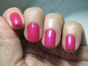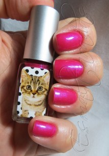 Ele é magenta bem vivo com microbrilhinhos azuis. Uma lástima que a Claire’s tenha economizado horrores nos vidrinhos, porque o pincel dessa coleção é um dos piores que eu já vi na minha vida. Tanto, que eu nem usei. Preferi pegar um dos pincéis dos vidrinhos vazios do mesmo tamanho e formato que adquiri na KK, que é bem macio e gostoso de usar, além de ser larguinho. Depois limpei e coloquei de volta no vidrinho dela, para não “descasar”.
