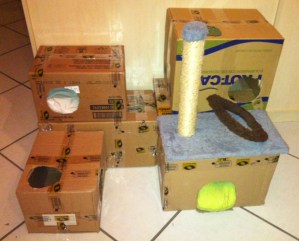 Sei que depois do episódio do aparelho, resolvi dormir para afogar a raivinha. E enquanto eu estava deitada na cama, esperando cair no sono, chega Gabi com o complexo habitacional felino que ela construiu.
