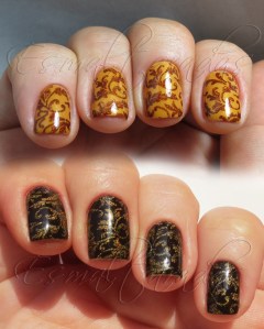Como não sei por que cargas d’água meu lindão “praguento” (de Praga, uhauhhauuhauha) de ontem levantou todo das minhas unhas, eu aproveitei então para fazer um “inverso” da mão direita, que está pintada de amarelo com carimbo marrom holo, pintando a não esquerda de marrom e carimbando com amarelo holo.