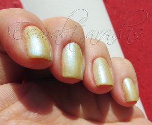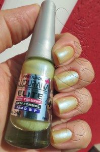 Esse esmalte é um amarelinho com pezinho distante no verde, e com brilhinhos azulados. É um esmalte de perolado, de uma consistência meio “gosmenta”.
