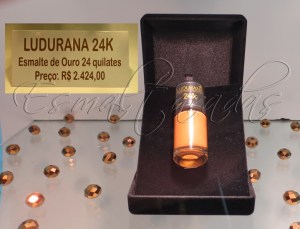 Abaixo, um esmaltinho que custa a bagatela de R$ 2424,00. Ouro 24K. Não é só o nome que é Ouro 24k. O esmalte é feito literalmente com pó de ouro 24 k – 5 gramas. Quem é a LOKA que vai pagar isso pra enfeitar as unhas por dois dias? Duvido que fique 15 dias como se promete… heheheh  O mais engraçado, é que nem dourado o esmalte era. Parecia uma massa alaranjada. Meio esquisito, confesso.
