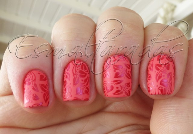 E aqui, a carimbada, já com o esmalte fosqueado com a cobertura matte sense da Blant. Usei para carimbar um esmalte alemão que peguei na KK, que é um vermelhão praticamente vinho. A cor dele é bem parecida com o Sensual, Única Camada da Colorama, que também serve pra carimbar.