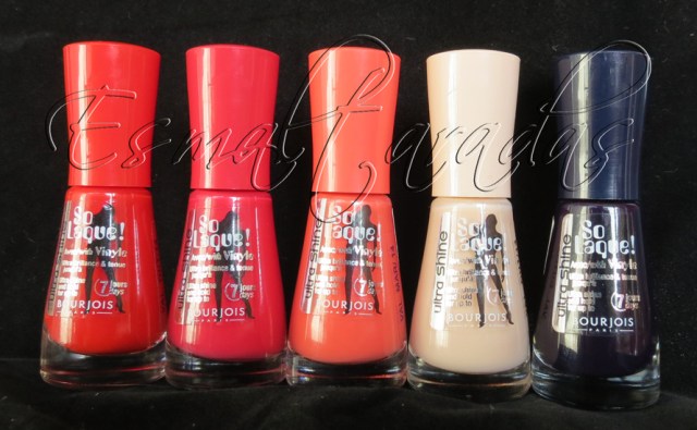 As cores são, da esquerda para a direita: Rouge Casino, Rouge Fashion, Tangerine Fatale, Beige Élégant e Bleu Mystérieux.