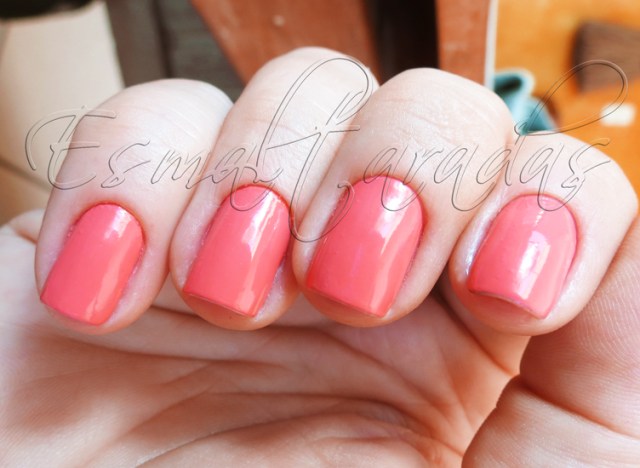 Esse esmalte tem uma cor meio complicada de definir. As fotos, definitivamente não mostram a realidade dela. É um rosa “acoralado”, porém, meio neon. Muito viva a cor. Não é essa “monotonia” que se mostra na foto.