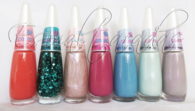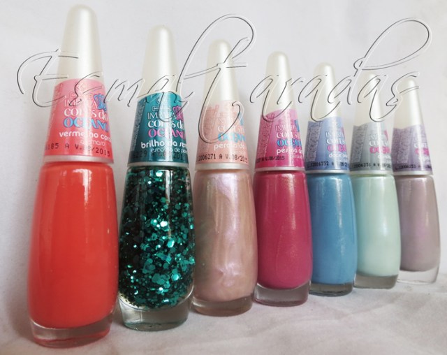 Não são cores diferentonas, mas eu gostei muito dessa coleção. A princípio comprei o Azul Cristalino (adoro um brilho! *_*) e os fofos Conchas e Pérola do Mar. Aí você me fez comprar o Pés na Areia e sábado que vem comprarei o Doce Oceano! hahah Uhm, talvez eu traga também o Água Viva… Vamos ver.