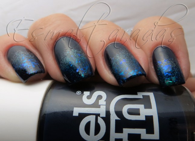 E assim ficou a mani acabada. Fiz um esponjado com o holo Hypnose da Jade e o flocado azul-verde Twist da Hits. Mas antes, deixei secar bem o esmalte de fundo.