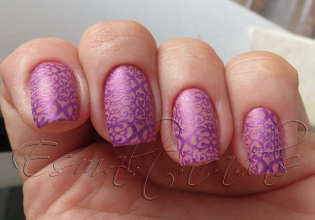 Depois cometi o pecado de carimbar, usando o esmalte HEAVY METALLILAC da Catrice, um roxo metálico lindão, que serve lindamente para carimbar.